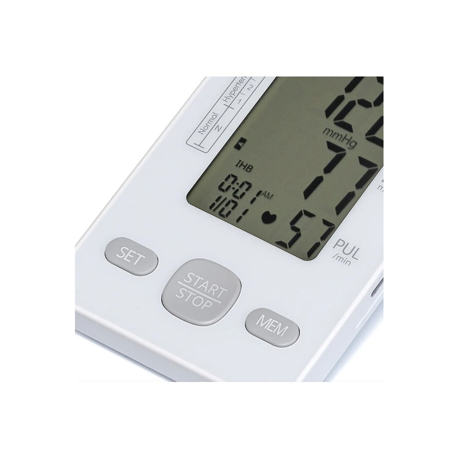 Mide presión sistólica, diastólica y frecuencia cardíaca, además de contar con indicador de pulso irregular y riesgo de hipertensión.