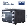 El BGH BHE25M23N es un horno eléctrico con un diseño moderno y funcional en color acero inoxidable y negro. Cuenta con una puerta de vidrio amplia y comandos de control accesibles. Además, dispone de tres posiciones de bandeja para seleccionar según el tipo de alimentos que se quieran preparar.