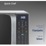 Con una capacidad total de 23 litros y sistema bifunción, este microondas digital combina potencia y estilo para transformar tu experiencia diaria. Su exterior color silver con puerta tipo mirror le da un toque moderno y elegante, ideal para cocinas con diseño contemporáneo. Su control digital por membrana y display LED blanco garantizan un uso cómodo e intuitivo.