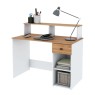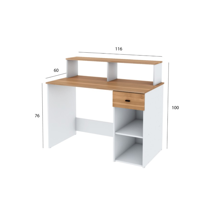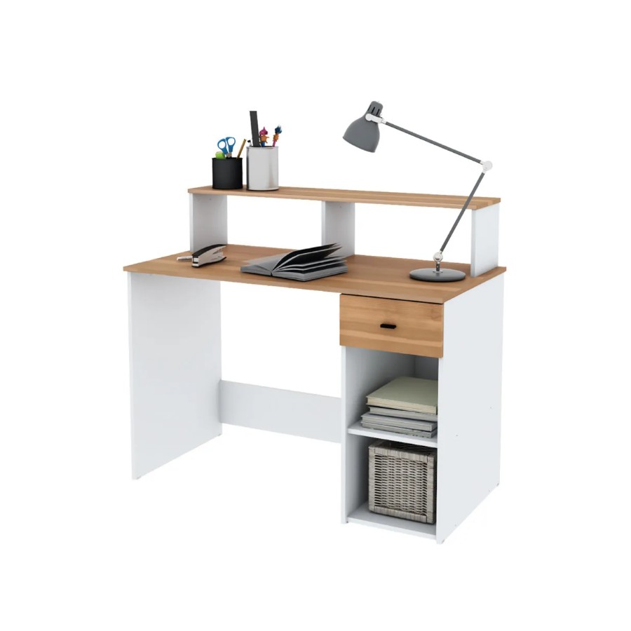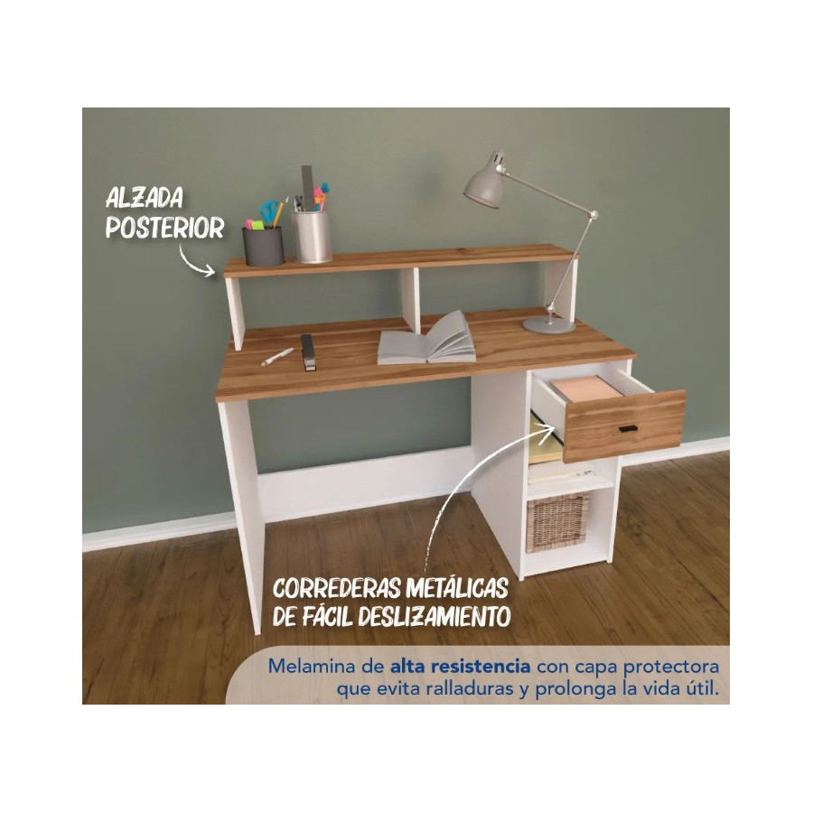 Escritorio de melamina de un tamaño ideal para ubicarlo en cualquier rincón de la casa. Contiene un cajón para organizar tus apuntes o material de trabajo y una alzada en la parte posterior para que decores y organices como más te guste.