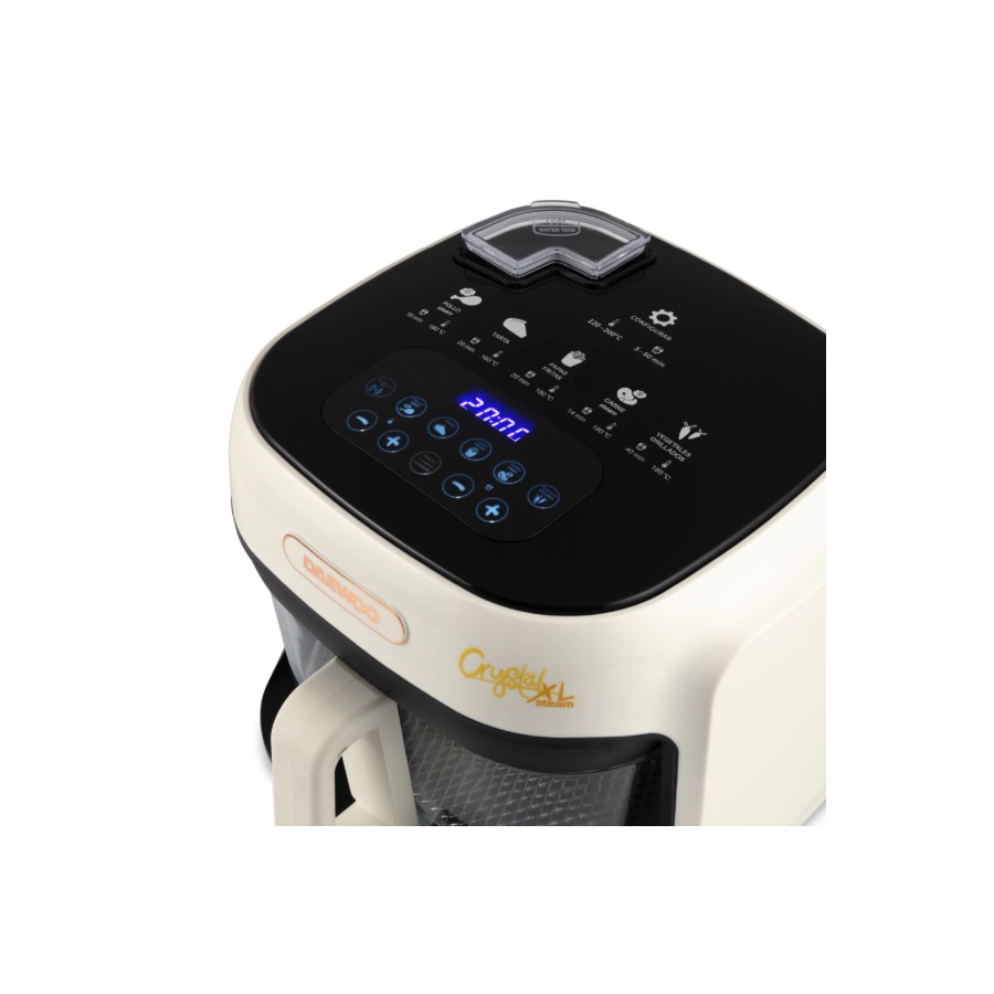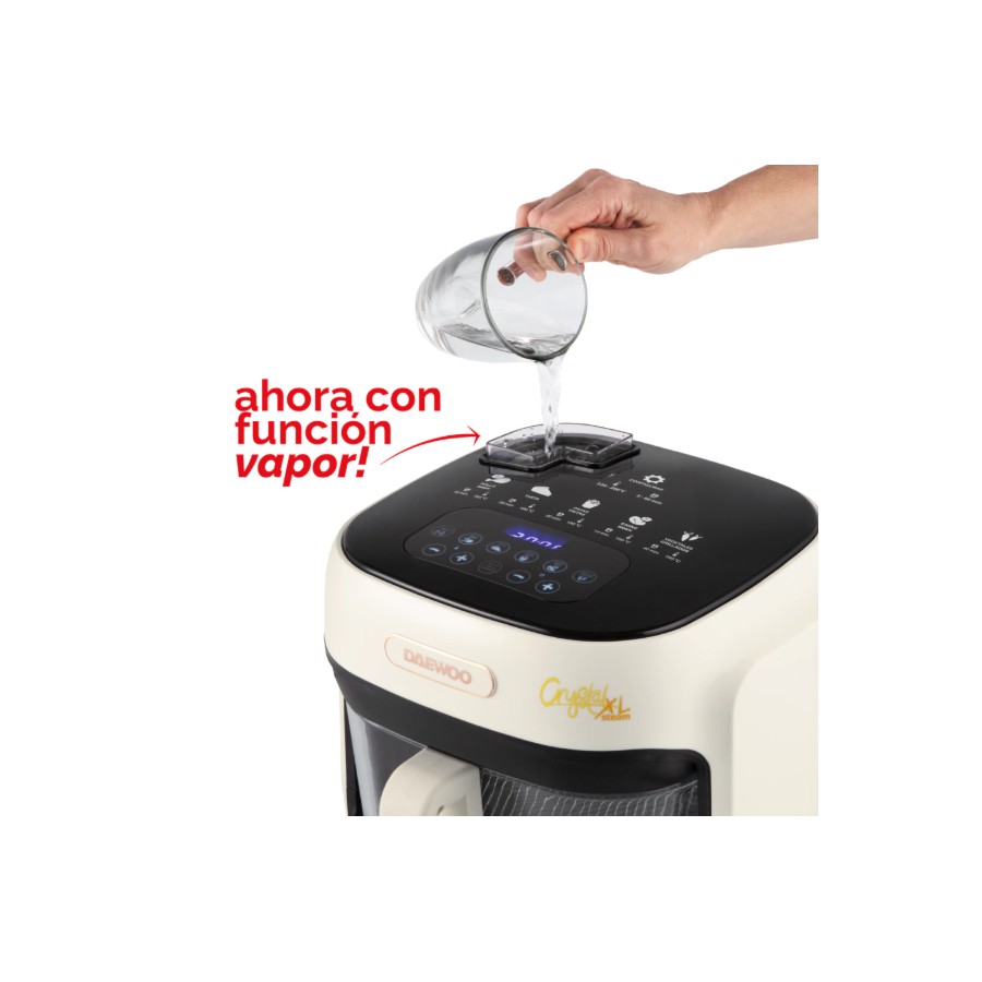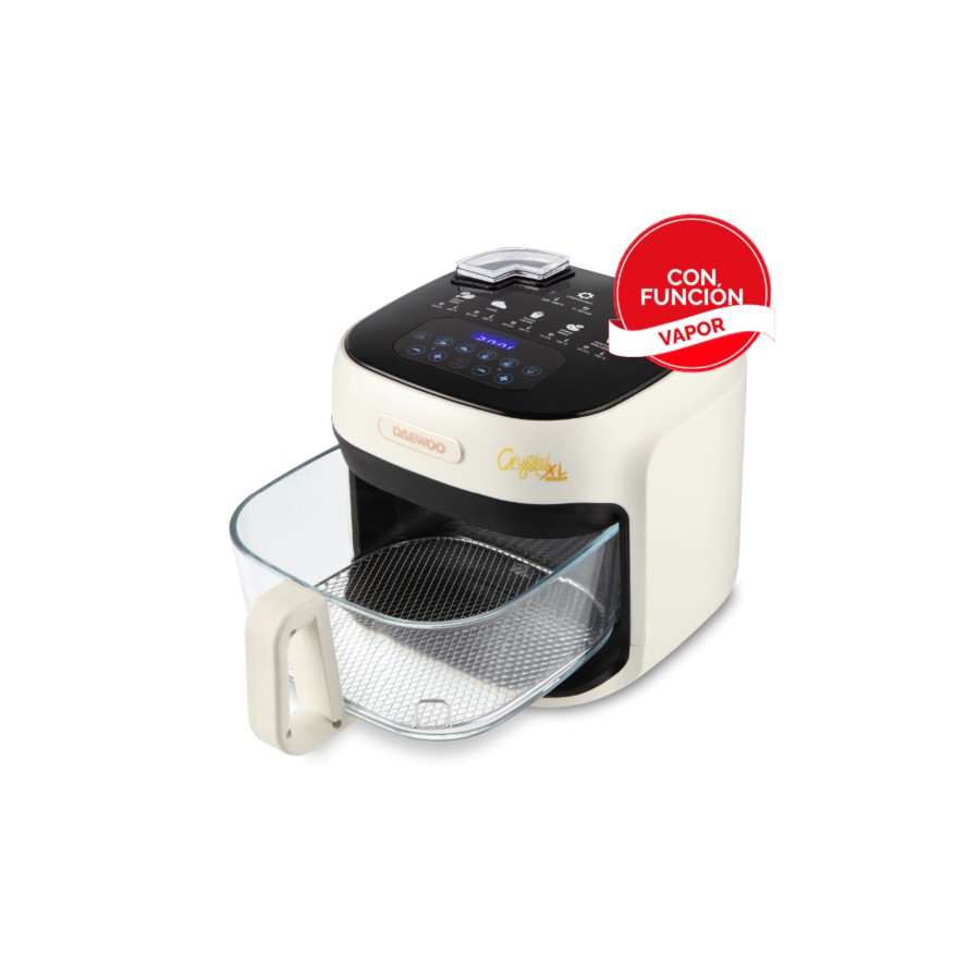 La Airfryer Crystal XL Steam de 7 litros es la evolución de la clásica Crystal, ideal para quienes buscan una cocina saludable, versátil y con un diseño sofisticado. Su bowl de vidrio de borosilicato sigue marcando la diferencia frente a las freidoras con recubrimiento de teflón: es un material inerte, no libera sustancias tóxicas, no altera el sabor de los alimentos y es seguro incluso a altas temperaturas. Además, es resistente a los cambios térmicos, no se raya y no absorbe olores ni grasa, lo que facilita la limpieza y prolonga su durabilidad. Su diseño transparente permite ver el proceso de cocción en todo momento para un control total de cada preparación.