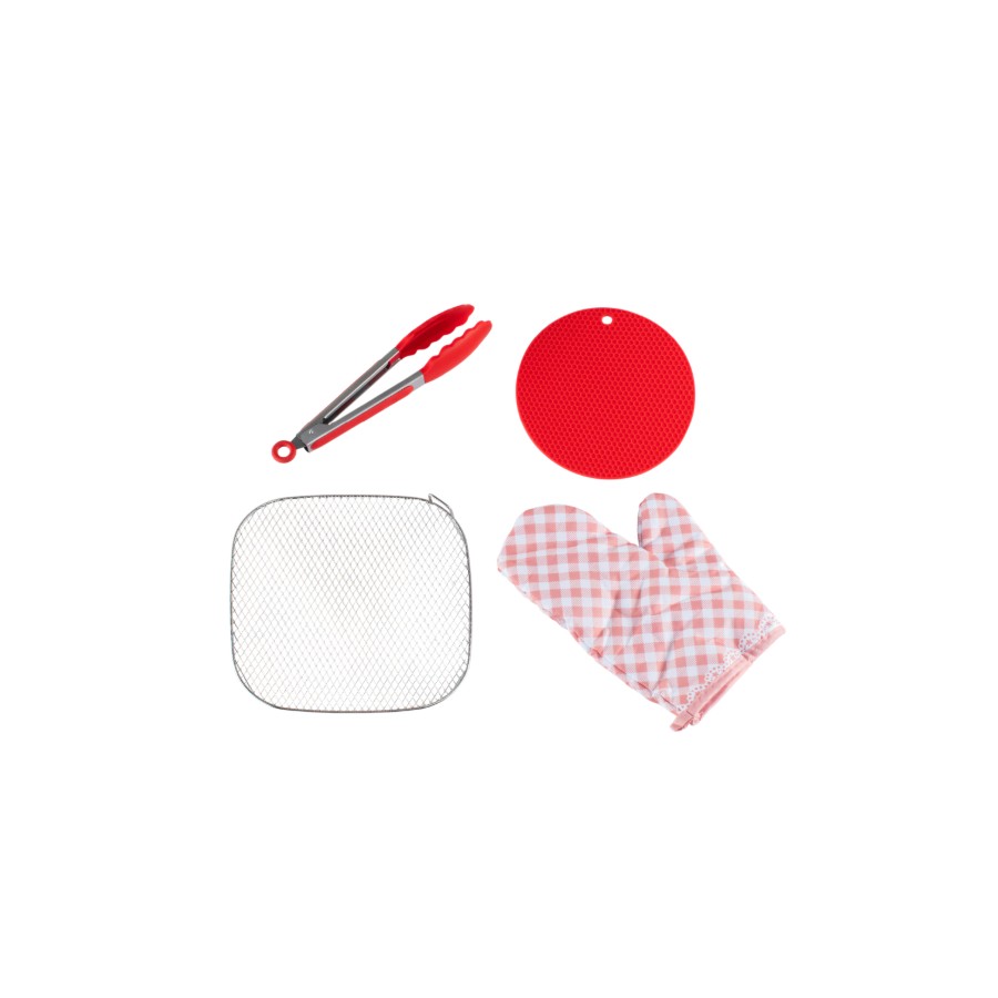 Incluye accesorios: pinza, pad antitérmico, guante, rejilla de acero inoxidable y recetario, para que disfrutes al máximo cada preparación.