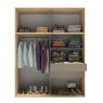 Ropero Duo con baulera, 4 puertas corredizas. Baulera de 65cm de altura. 2 cajones internos con guias telescopicas. Manijon, guias y perchero de aluminio. Melamina de 15mm.