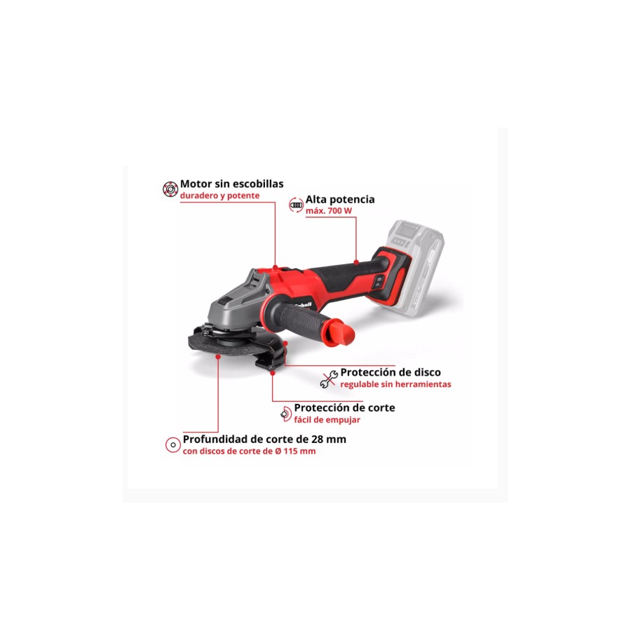 La amoladora angular con batería TE-AXXIO 18/115 de Einhell es un ayudante potente, inalámbrico y cómodo en los trabajos en el taller, casa y garaje. La amoladora angular es miembro de la familia Power X-Change, en la que una batería se puede utilizar en todos los equipos de la serie del sistema. Se pueden lograr resultados óptimos hasta una profundidad de corte de 28 mm con un disco de corte de Ø 115 mm y una batería de 2,5 Ah. El equipo se acciona por el motor sin carbones, este motor ofrece más potencia y una vida útil más prolongada que los motores de escobillas de carbono convencionales.