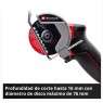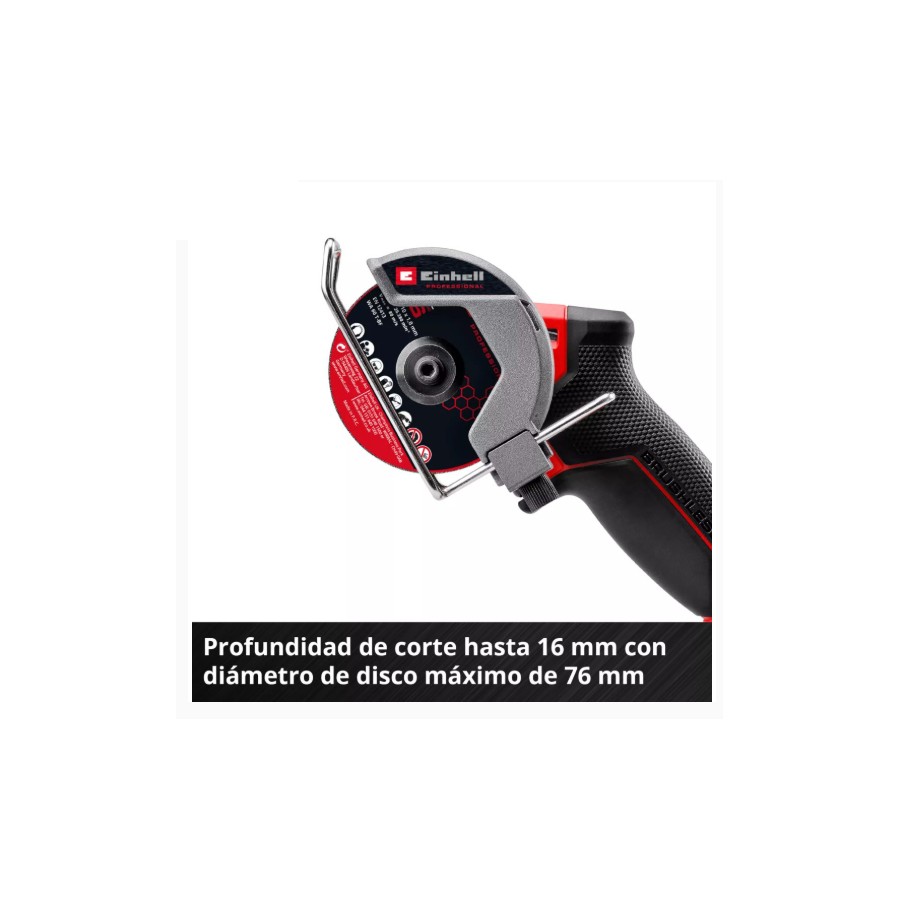 La amoladora de corte inalámbrica Einhell Professional TP-CO 18/76-C Li BL-Solo es una verdadera todo terreno para trabajos exigentes. Compacta y liviana, corta metal, cerámicos y piedra más rápido y fácil que muchas amoladoras angulares más grandes. Pertenece a la familia Power X-Change y es compatible con todas las baterías y cargadores del sistema. Incorpora motor Brushless Einhell, que ofrece más potencia y mayor autonomía que los motores con carbones; con registro online, el motor cuenta con 10 años de garantía. Utiliza discos de 76 mm y permite ajustar la profundidad de corte sin herramientas hasta 16 mm según el material. Trae electrónica de velocidad para regular las rpm y luz LED para una visibilidad óptima. El protector de disco es giratorio y se ajusta sin herramientas para cualquier posición de trabajo. Una rejilla antipolvo integrada y el ducto de aire inteligente protegen el interior y prolongan la vida útil; las rejillas son desmontables para limpieza. La seguridad está garantizada por la protección contra rearranque y el freno de motor, que detiene el disco rápidamente. La llave Allen para el bloqueo del eje viaja guardada en el equipo. Incluye un disco diamantado para cerámicos y tres discos finos para metal. Batería y cargador no incluidos.
