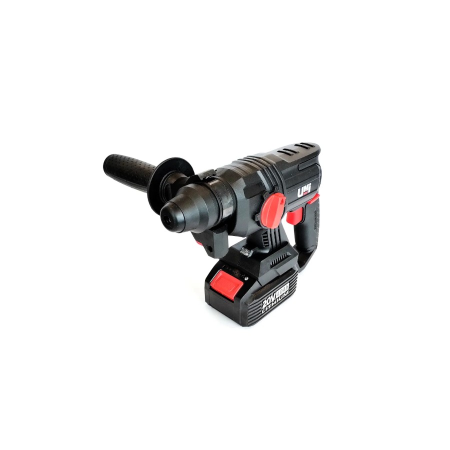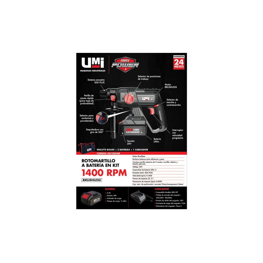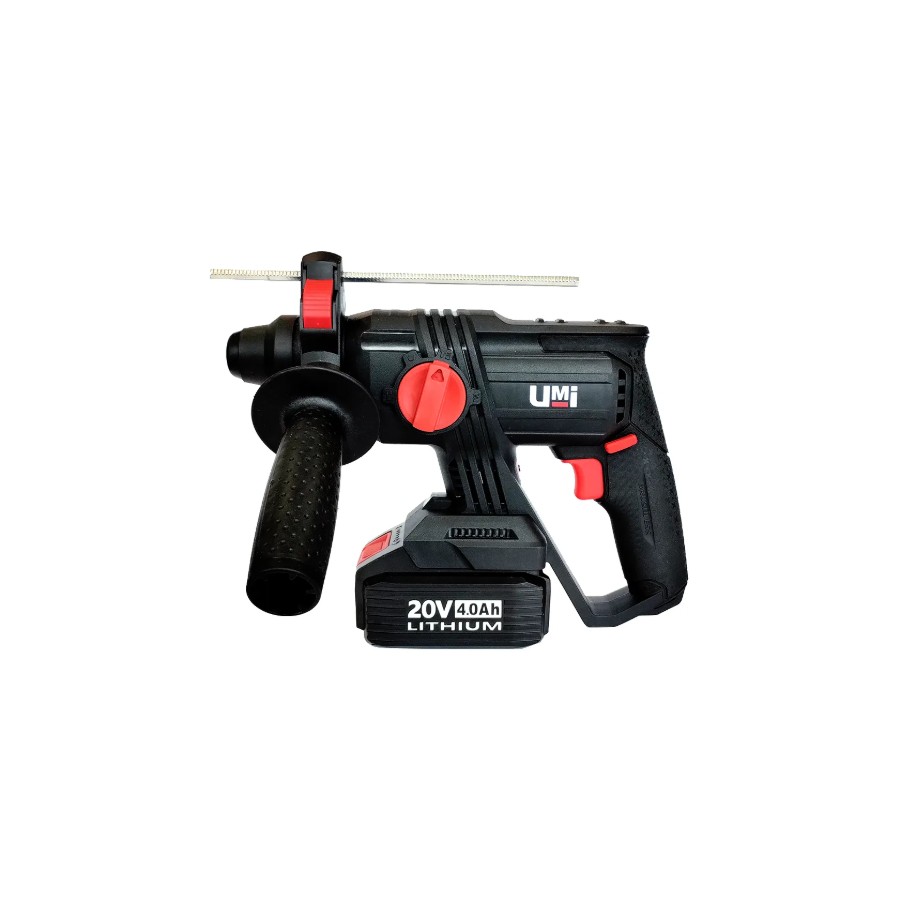 Potente y versátil rotomartillo inalámbrico UMI MAX POWER de 20V con motor Brushless, tres modos de operación (martillo, taladro y taladro percutor), encastre SDS PLUS y empuñadura giratoria de 360°. Incluye bolso, dos baterías y cargador.