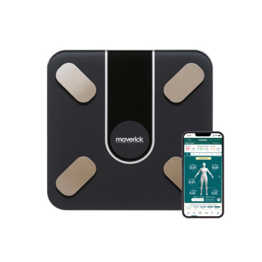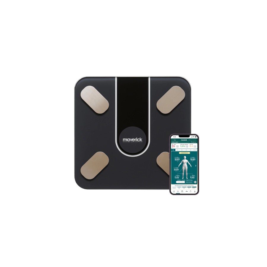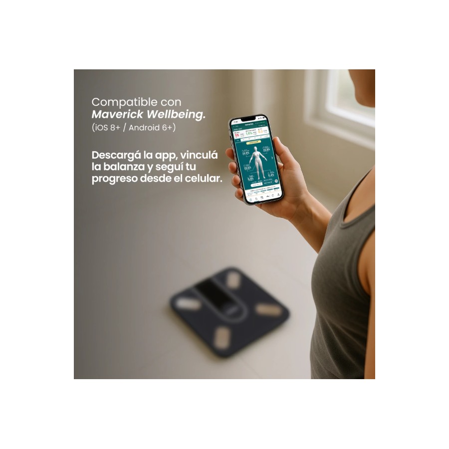 📱 Conectividad inteligente: Sincronizá la balanza con tu celular mediante la app Maverick Wellbeing, disponible para iOS y Android.