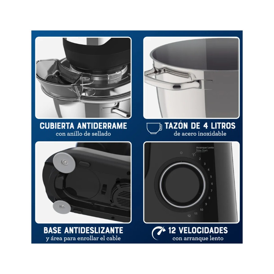 Batidora con acción planetaria con 12 velocidades con arranque lento.