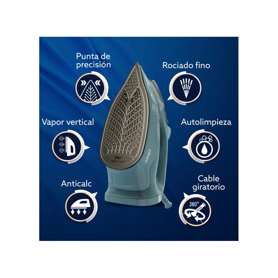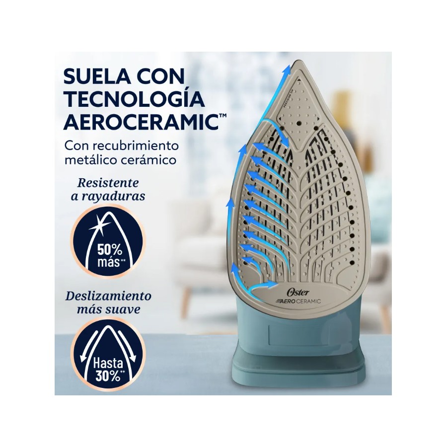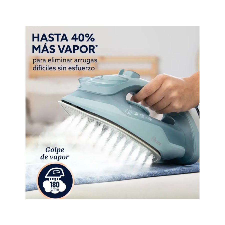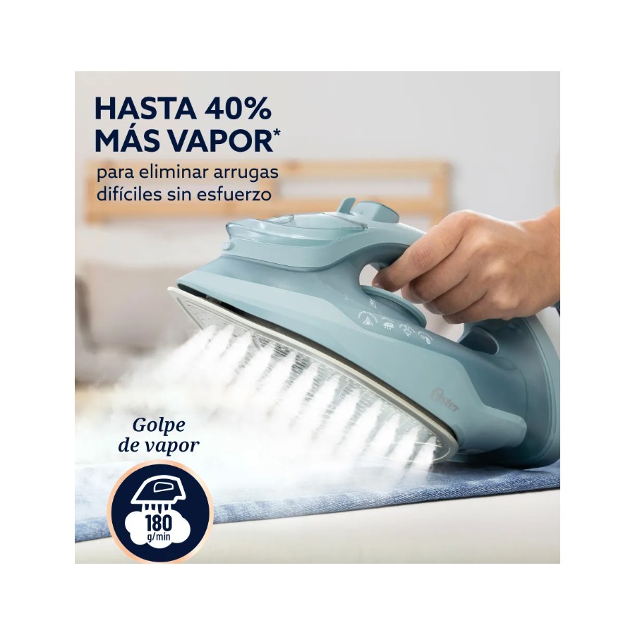 La plancha Oster® AEROGLIDE está pensada para quienes buscan resultados rápidos y sin complicaciones. Genera hasta 40% más vapor* para eliminar hasta las arrugas más difíciles. Su suela Aeroceramic se desliza 30% mejor** y es 50% más resistente a rayaduras**, con 25% más cobertura* para planchar más en menos tiempo. Incluye golpe de vapor vertical para planchar sin tabla, punta de precisión para llegar a zonas difíciles, cable giratorio que evita enredos, rociado fino y tecnología anticalc que ayuda a prevenir manchas. También cuenta con función de autolimpieza que prolonga su vida útil.