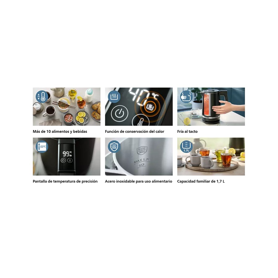 Té, café, comida infantil, chocolate, fideos instantáneos y más se pueden calentar a distintas temperaturas. Esta hervidora con control de temperatura ofrece 6 configuraciones de temperatura desde 40 °C hasta 100 °C para servir con perfección y seguridad siempre.