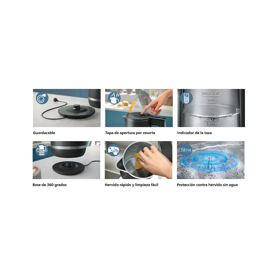 Ideal para servir a toda la familia o un grupo. Con una capacidad de 1,7 L, nuestra hervidora puede hervir eficientemente suficiente agua para hasta 7 tazas.
